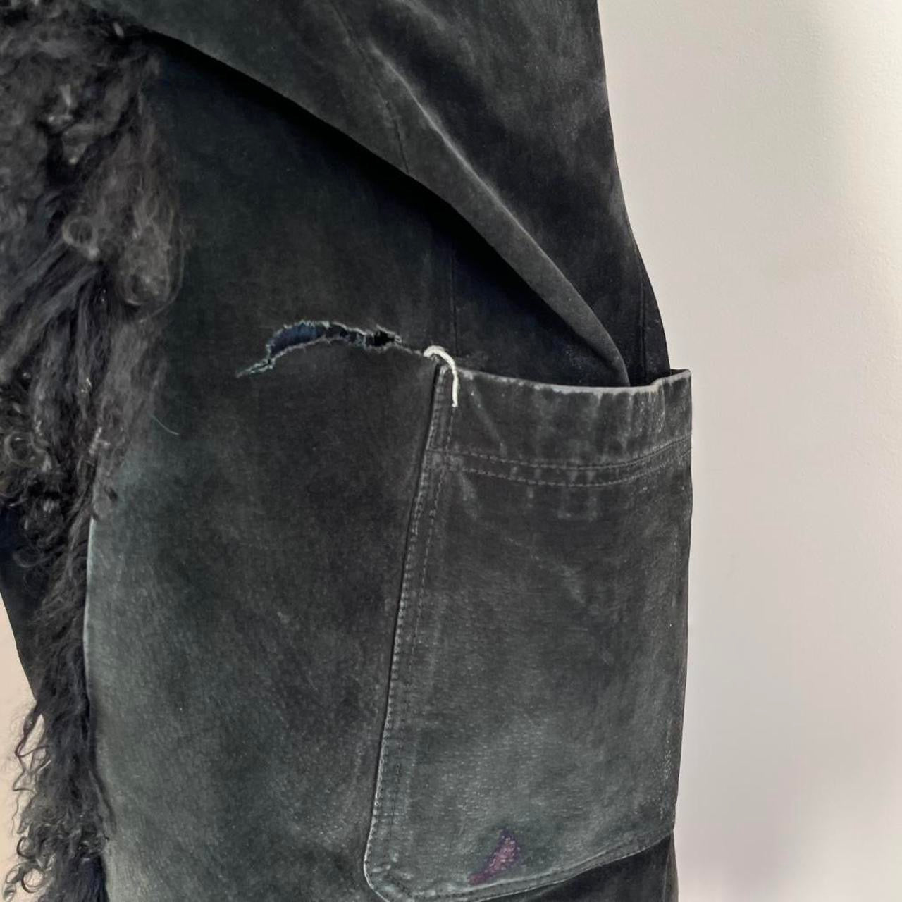 2000s Black suede Mongolian fur coat. Rip on pocket and some wear on the suede but otherwise good condition. Single clasp closure. By Kit states size U.K. 12 length 44 inches