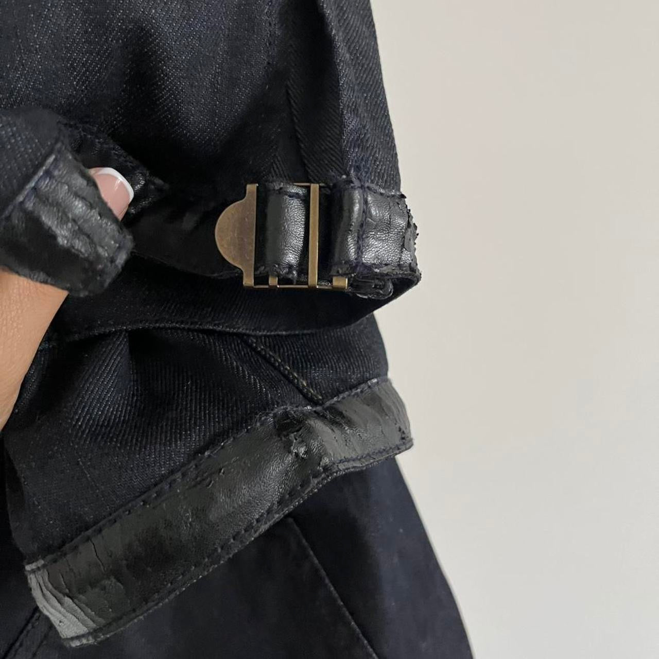 2000s deadstock dark navy denim capri jeans with adjustable faux leather cuffs. States size waist 29 best fits U.K. 8