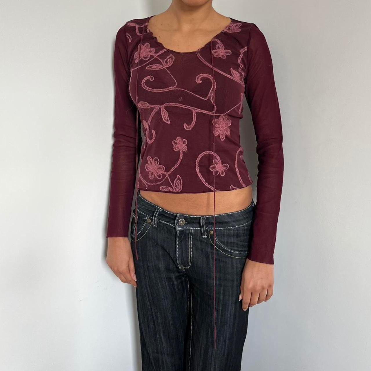 2000s Burgundy and pink floral mesh long sleeve tops states size M best fits U.K. 8/10