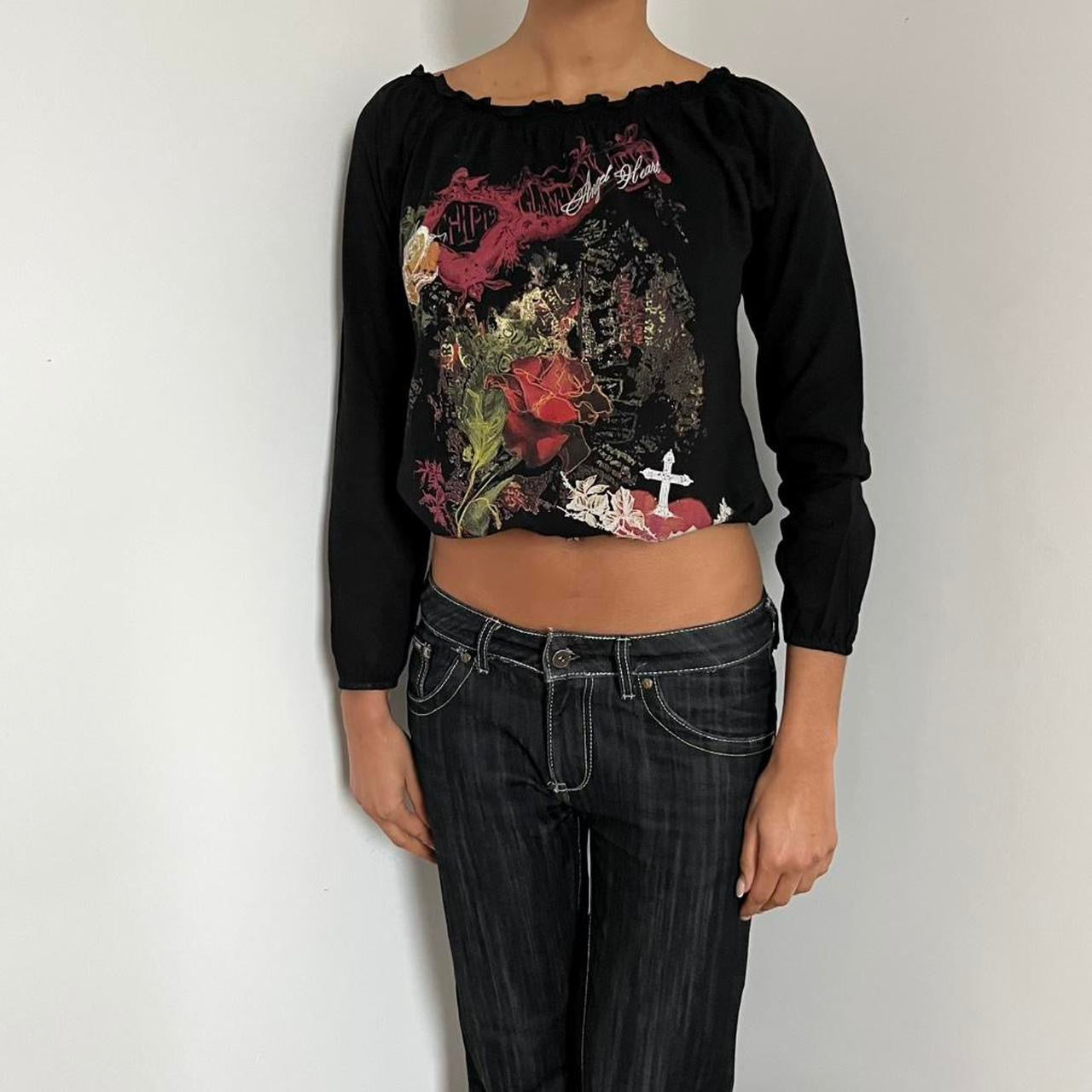 2000s Black long sleeve off the shoulder top with floral and cross design 100% cotton states size 1