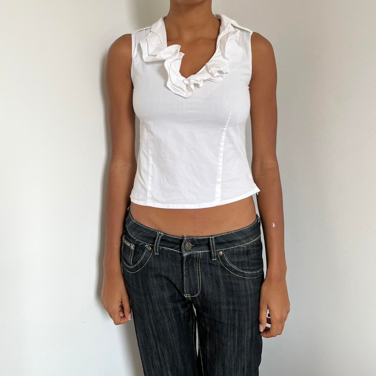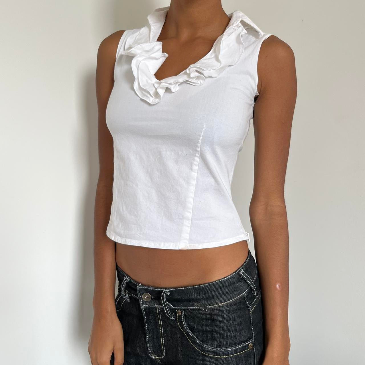 White ruffled collar top. Zips up at the side. 50% cotton . States size 8 best fits size U.K. 6/8 small mark reflected in price
